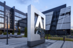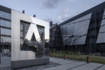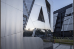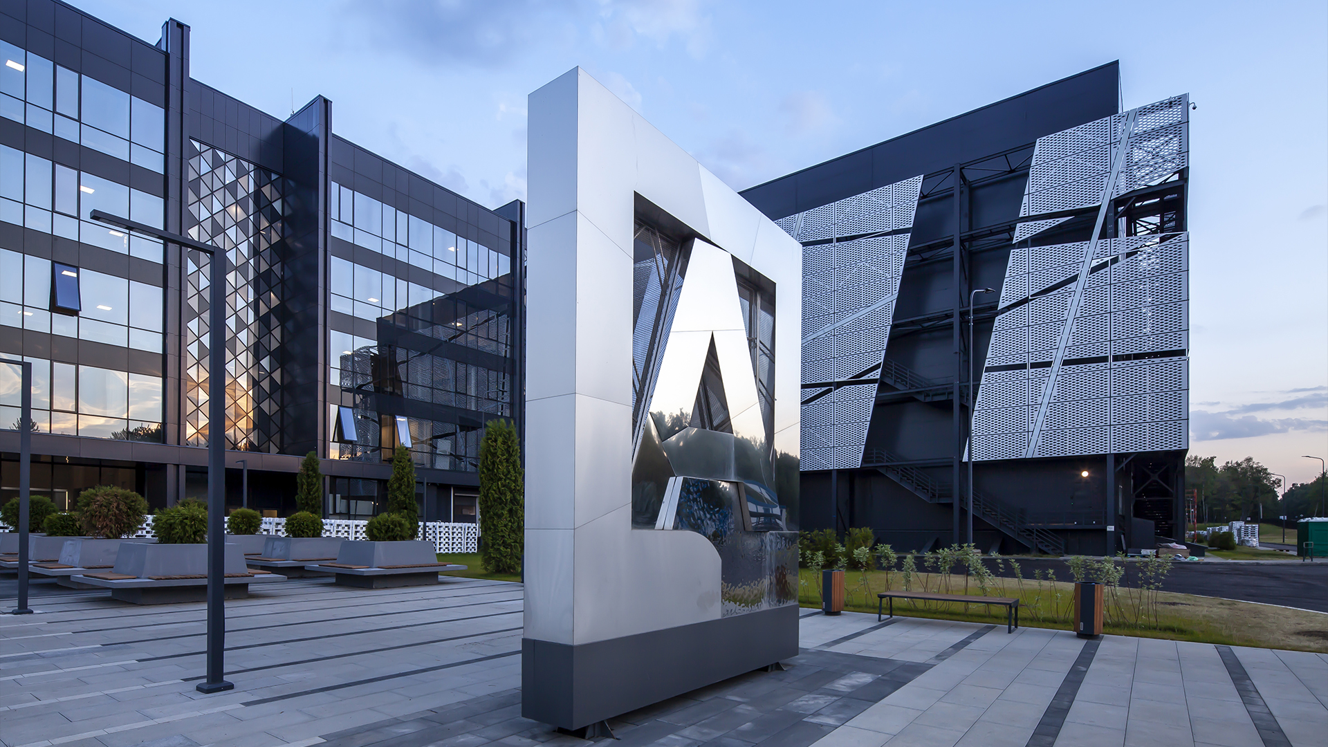 Street stele made of three types of stainless steel with night illumination in the form of the logo of the Main Archive Department