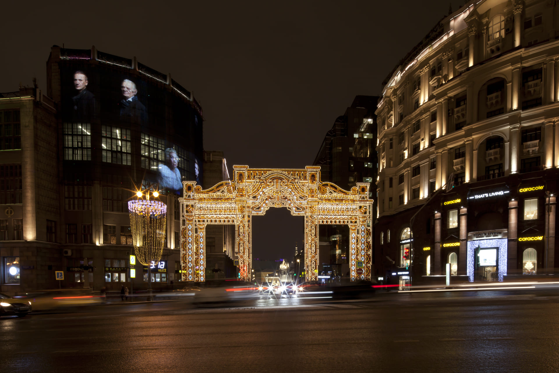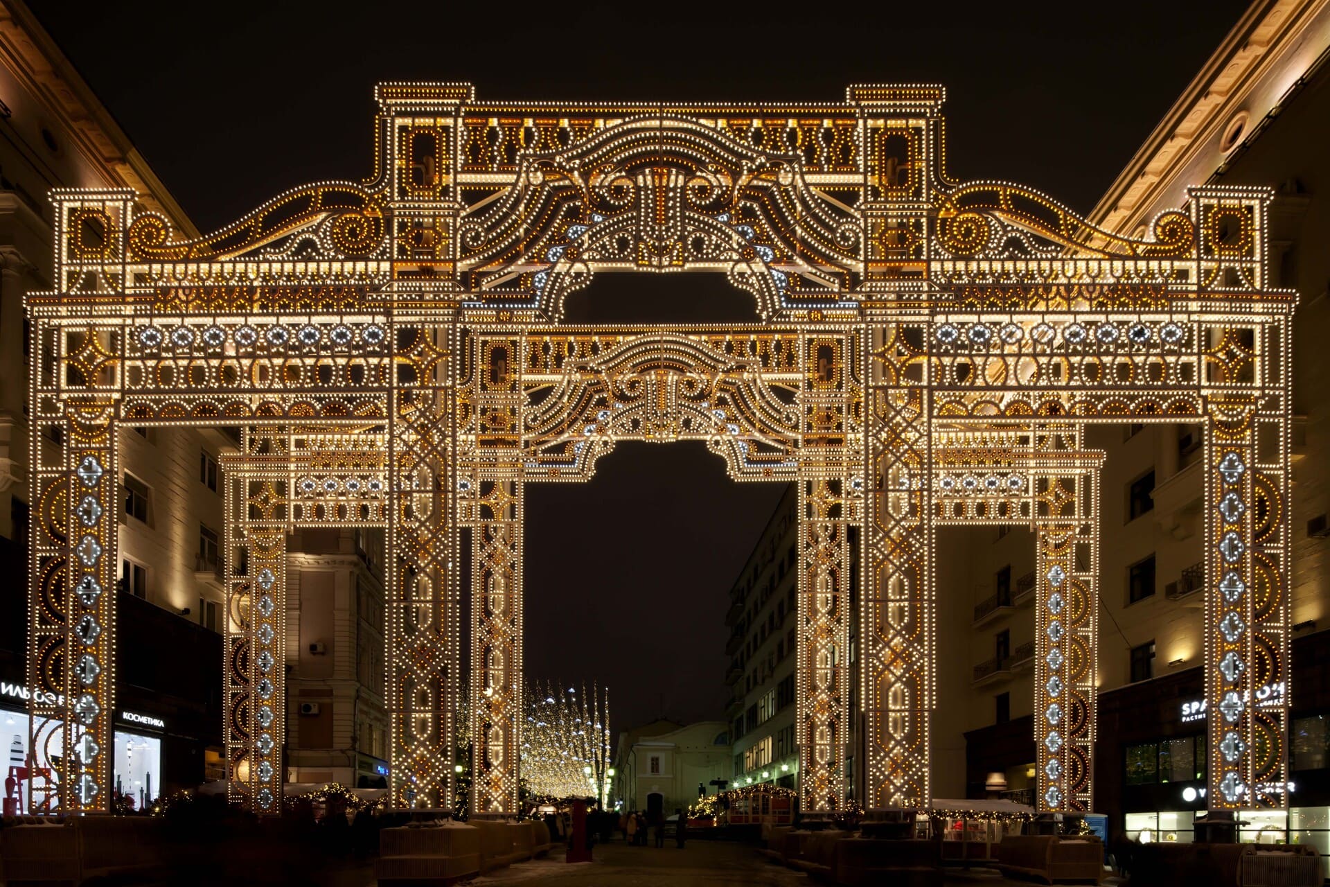 At the exit on Tverskaya Street, two symmetrical 25-meter light arches were installed, made in the style of the Chekhov Moscow Art Theater located nearby. Arches overlap with each other and differ in the folds of the curtain.